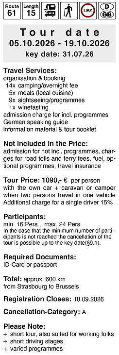 Luxemburg offers an interesting mix of history and modern Europe. Maastricht is not just chosen because it is the namesake of some famous contracts. The tour ends in Bruxelles with an extensive sightseeing programme.